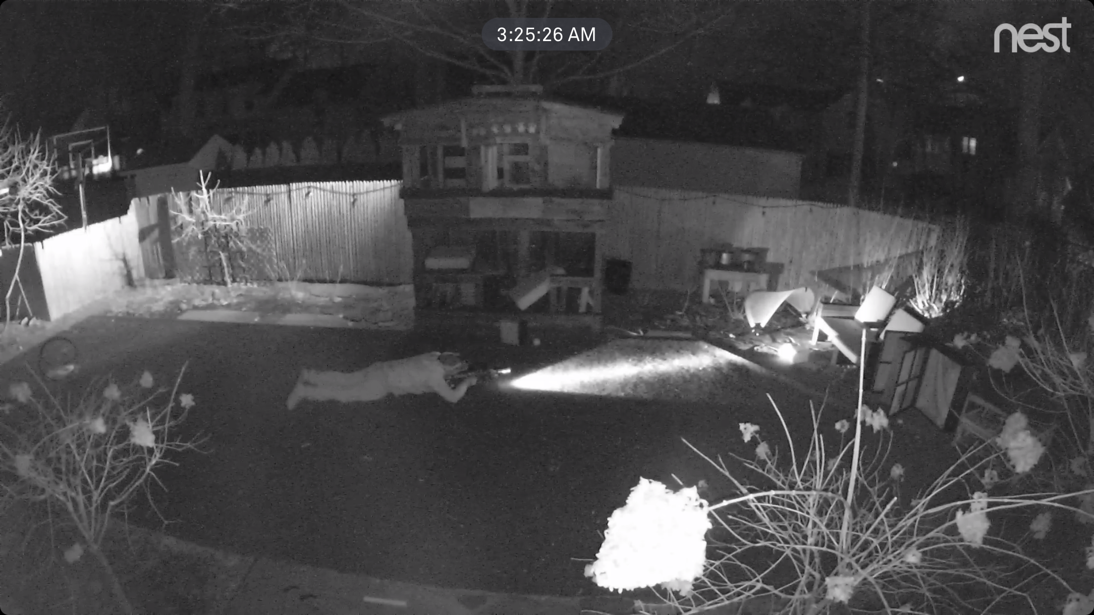 I have to find it though, and figure it couldn’t be far. This thing has a broken leg, and still has a trap on it. I jump out the front door… Delta force style double back around the house whilst looking through my scope. In my mind I was badass, but the later footage proved otherwise… I looked like a middle age dude wearing slippers holding a pellet gun.