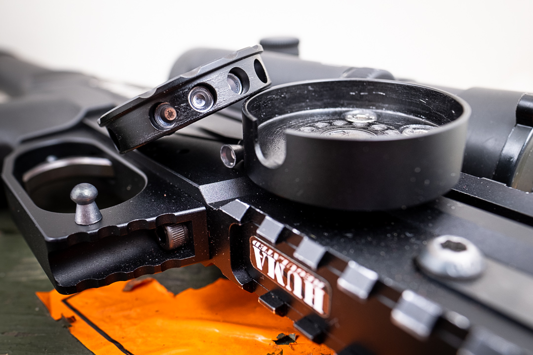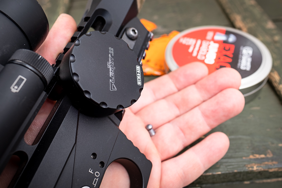 With gun pointing in safe direction turn it upside down and load the pellets by rotating ammo cylinder. Ball-bearing indexing aligns it perfectly for each pellet. In .22 it holds 13 rounds. Yeah, it's caliber specific so my advise – if you're using 2 calibers and swap barrels all the time – get dispenser in bigger caliber and just use for both. However, if you want to store maximum number of pellets and you don't swap barrels each day – I'd recommend to buy specific ones as the differences are considerable. In 177 it holds 17 rounds and 25 holds 11. Anyway… the choice is yours BUT if you're using 177 I'd definitely recommend to get this specific one. There's a clear difference between 17 and 11 pellets close at hand.